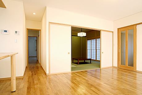 親世帯の住む1階は、無垢材の味わいが活きる温かい雰囲気に仕上がっています。リビングと和室が続き間になっているため、家族全員がその広いスペースに集まって、食事やおしゃべりを楽しむこともよくあるということです。