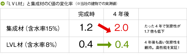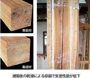 古代の木造建築物にも使われてきた無垢材や集成材。木は日本の気候に最も適した材料です。しかし、現在求められる「気密性」という部分では、問題が生じてしまいます。無垢材、集成材では乾燥や経年変化によって木材の収縮、ソリやワレがおこり気密性の低下を招き、冷暖房効率や耐震性において初期の高性能を維持することが難しいという弱点が露呈しました。