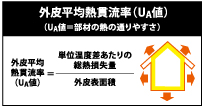 UA値は、住宅の内と外の温度差が1℃ある場合、建物内部から逃げる1時間あたりの熱量を外皮等の面積の合計で割った値で、躯体を構成する部位の「熱の伝わりやすさ」を表します。