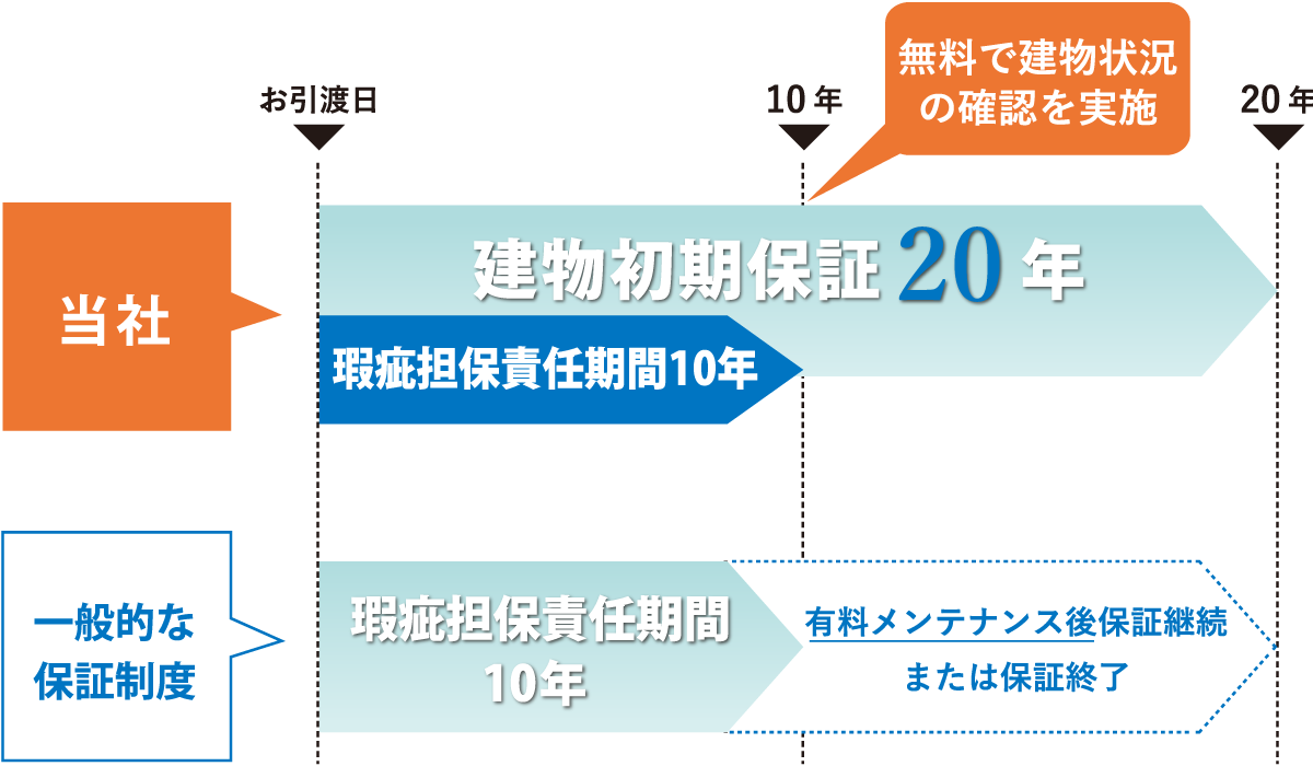 そのため、住宅会社の保証は10年間というのが一般的ですが、当社はお客様に長期の安心をご提供するために初期保証20年間としております。